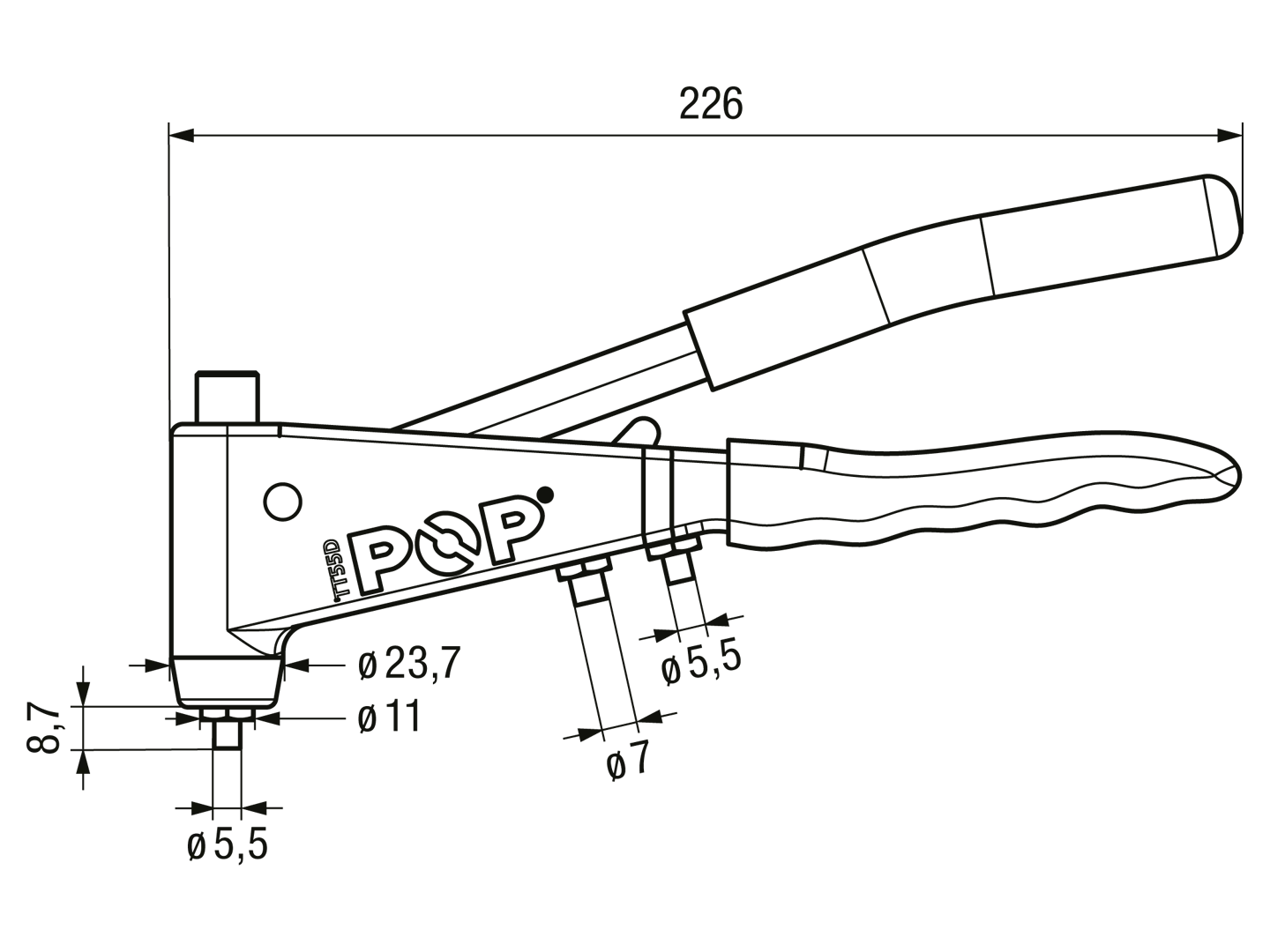 Ved brug af tangen til andre nittediametre, skal mundstykket skiftes ud.