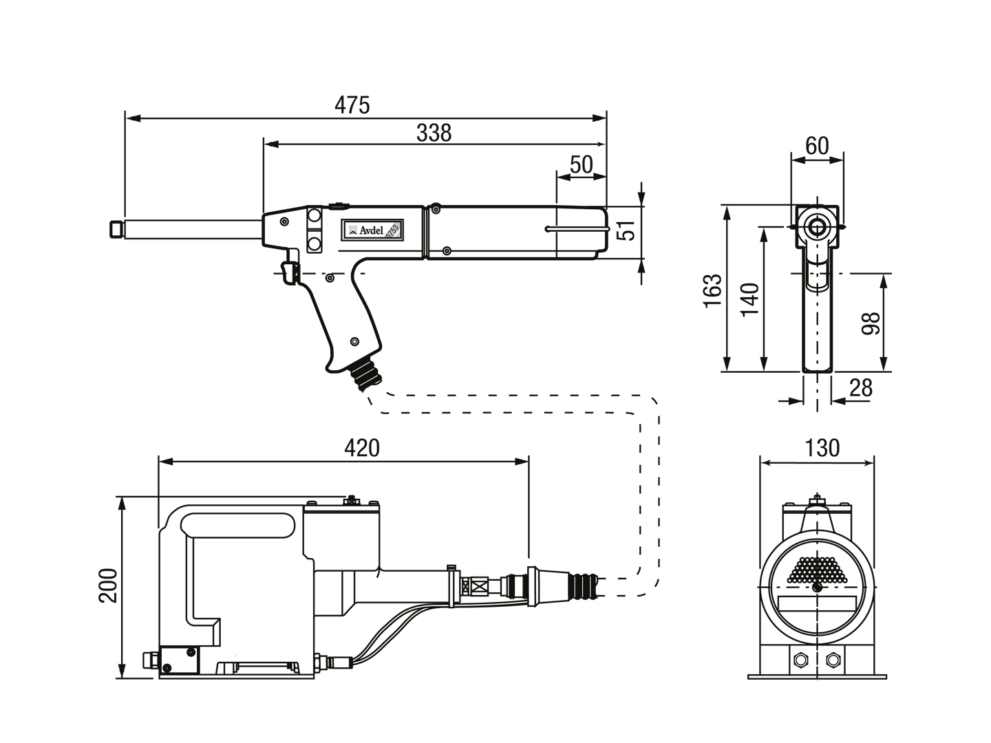BeskrivelseProduktbeskrivelseTil nitter med Ø: 2,4 - 6 Vægt, pistol: 1,2 kg Slaglængde: 30 mm Cyklustid (ca.): 1 sekund Driftstryk: 5 - 7 bar Luftforbrug: 2,6 l fri luft / cyklusVarianter